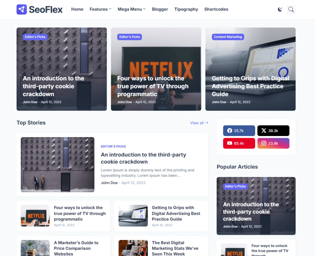 One of the standout features of SeoFlex is its modern user interface, offering an attractive layout with proper spacing, beautiful post thumbnails, and impressive typography. Social share buttons, related post widgets, and breadcrumb navigation keep readers engaged and encourage them to explore more content on your website.